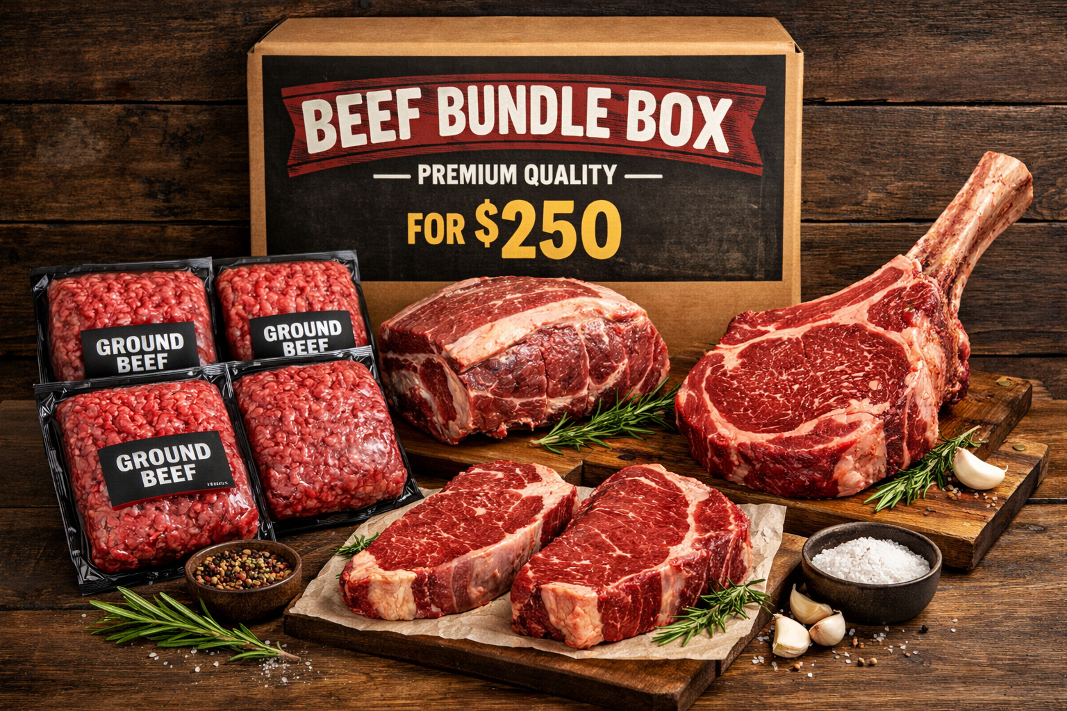 Includes all of bundle box 1 plus 1 Tomahawk Steak and 2 additional Ground Beef Pkgs. Approximate weight 9-10lbs.
