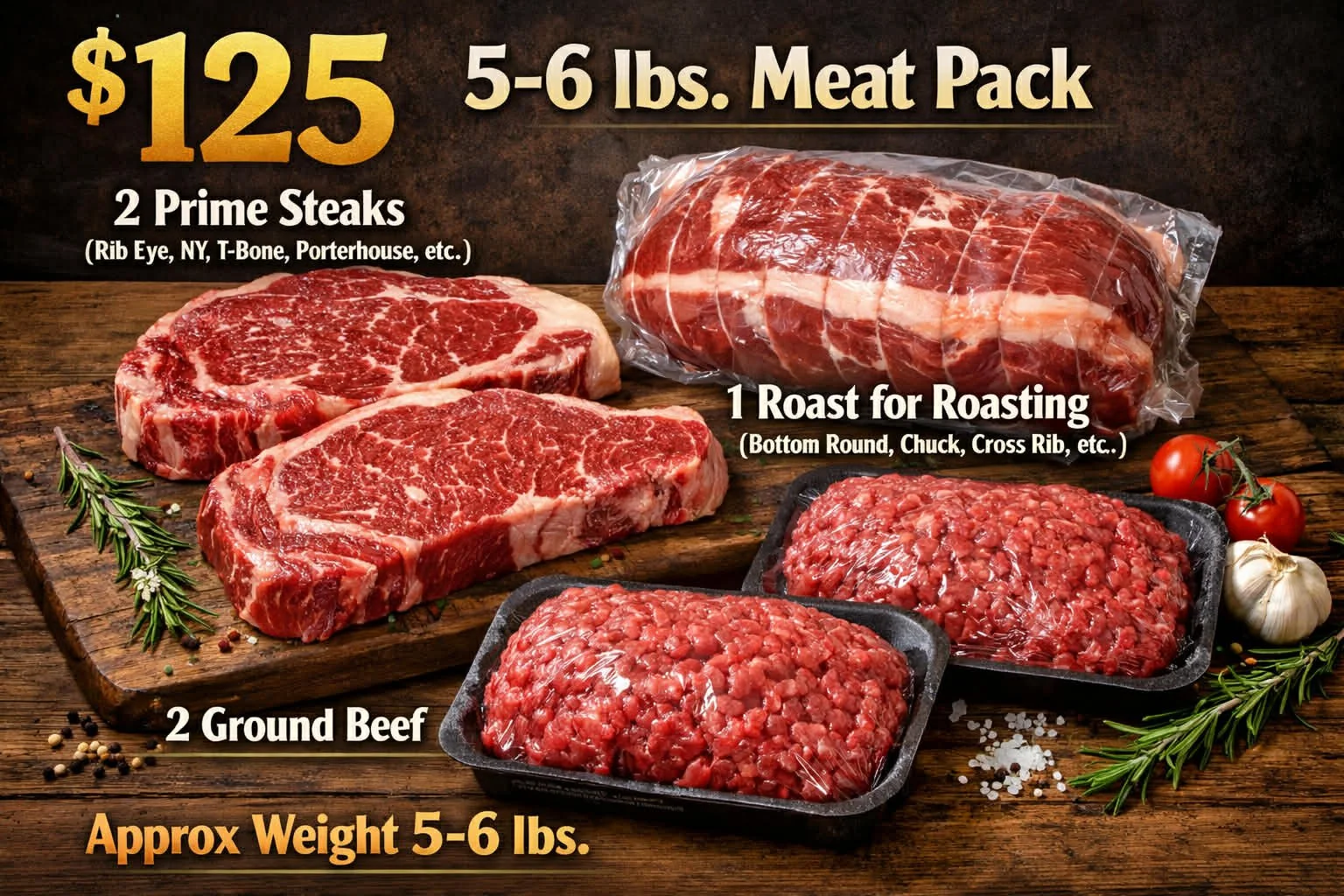 This bundle includes 2 prime steaks (rib eye, NY, T-bone, london broil, etc.,.) 2 ground beef packs, 1 beef for roasting (bottom round, chuck, cross rib, etc.,.) Approximate weight 5-6lbs.